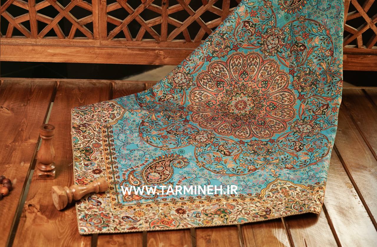 رومیزی مربع ترمه برند نگین خاتم طرح افشار رنگ آبی فیروزه ای
